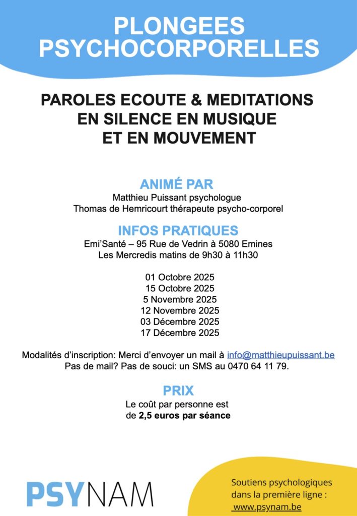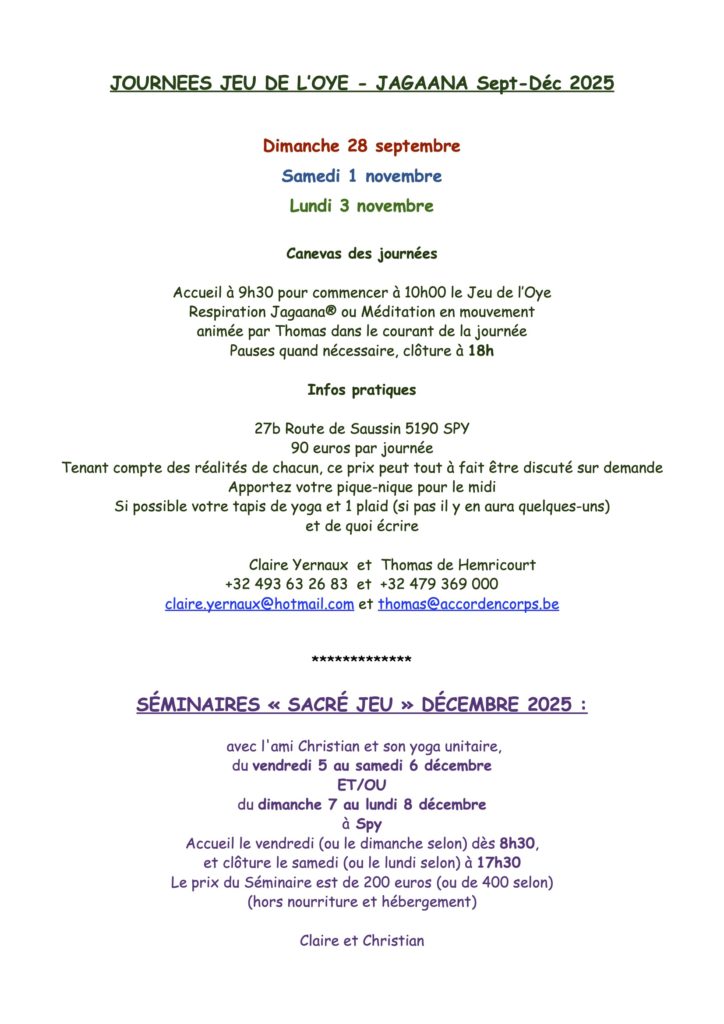 Co-animées avec Matthieu Puissant dans la yourte du Centre Emi’Santé: 6 mercredis matins d’octobre à décembre 2025. Deux heures pour la parole, l’écoute, les échos/reflets, le retour au corps, la méditation, en mouvement ou non, en silence ou en musique, la Respiration Jagaana®.